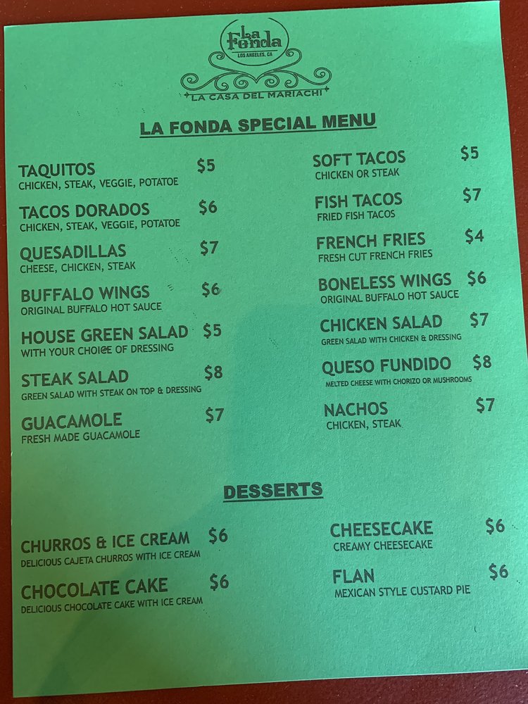 La Fonda is a Mexican venue in Los Angeles offering a unique dining experience. With live music, a full bar, and gender-neutral restrooms, it caters to a diverse crowd. The menu includes classic dishes like carne asada and enchiladas, complemented by flavorful chips and salsa. The atmosphere is vibrant, with energetic Mariachi interactions and attentive service. While some find the prices slightly high, the quality of the food and entertainment justifies it. The restaurant provides street parking and valet options. Overall, La Fonda is ideal for group gatherings, special occasions, or even a romantic date. The historic ambiance and exceptional Mariachi performances create a memorable dining experience for patrons.